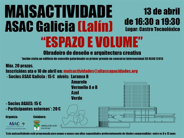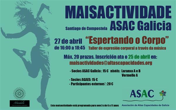 Data da actividade 27 de abril de 2019 en Rúa Nova de Abaixo nº 19 Santiago de Compostela. Inscrición ata o 25 de abril de 2019 en maisactividades@altascapacidades.org Socios ASAC Ga...