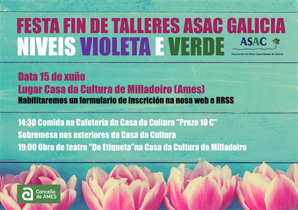 Festa fin de talleres de ASAC Galicia niveis Verde e Violeta Data 15 de xuño de 2019 Lugar Casa da Cultura de Milladoiro. Concello de Ames 14:30 Comida na Cafetería da Casa da Cultura &qu...