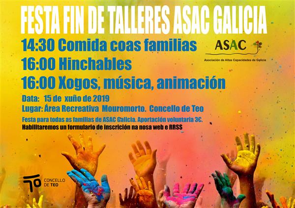 Festa fin de talleres de ASAC Galicia Data 15 de xuño de 2019 Lugar Área Recreativa Mouromorto. Concello de Teo A festa realizarase nunha contorna ao aire libre, con mesas para xanta...