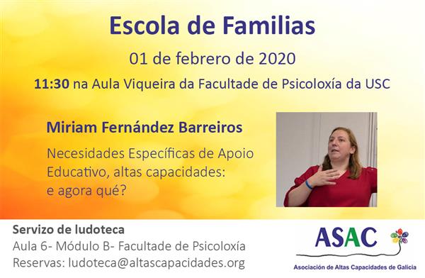 Xa están disponibles os materiais da Escola de Familias "NEAE AACC: e agora qué?" que impartiu Miriam Fernández Barreiros o día 1 de febreiro de 2020